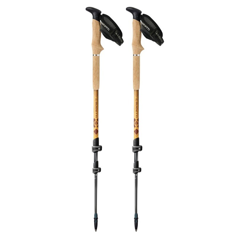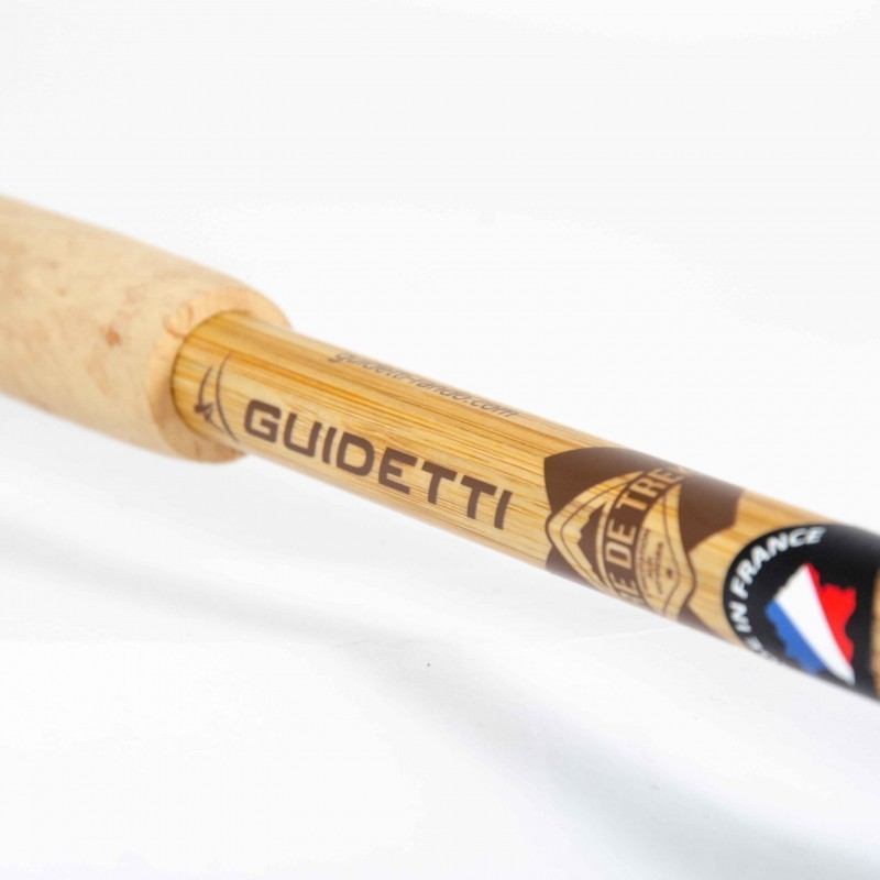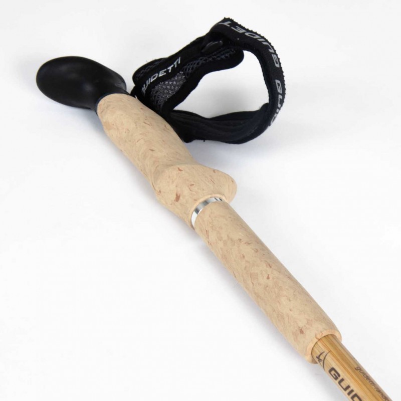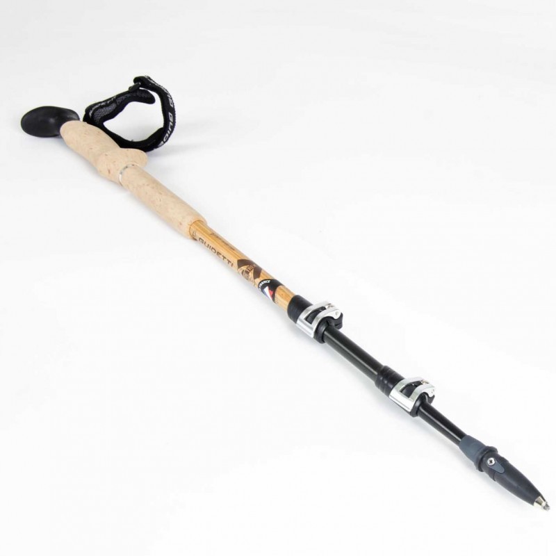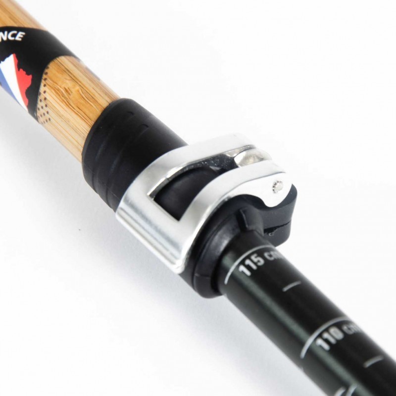 C’est un bâton de randonnée réglable composé de trois brins : deux en aluminium et un en carbone (brin haut), avec revêtement bambou.