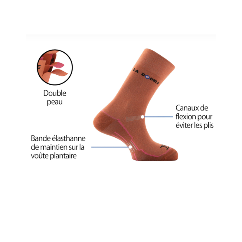 Structure double couche : une première chaussette adhère au pied, une seconde adhère à la chaussure, ce qui réduit les frottements et les échauffements.
